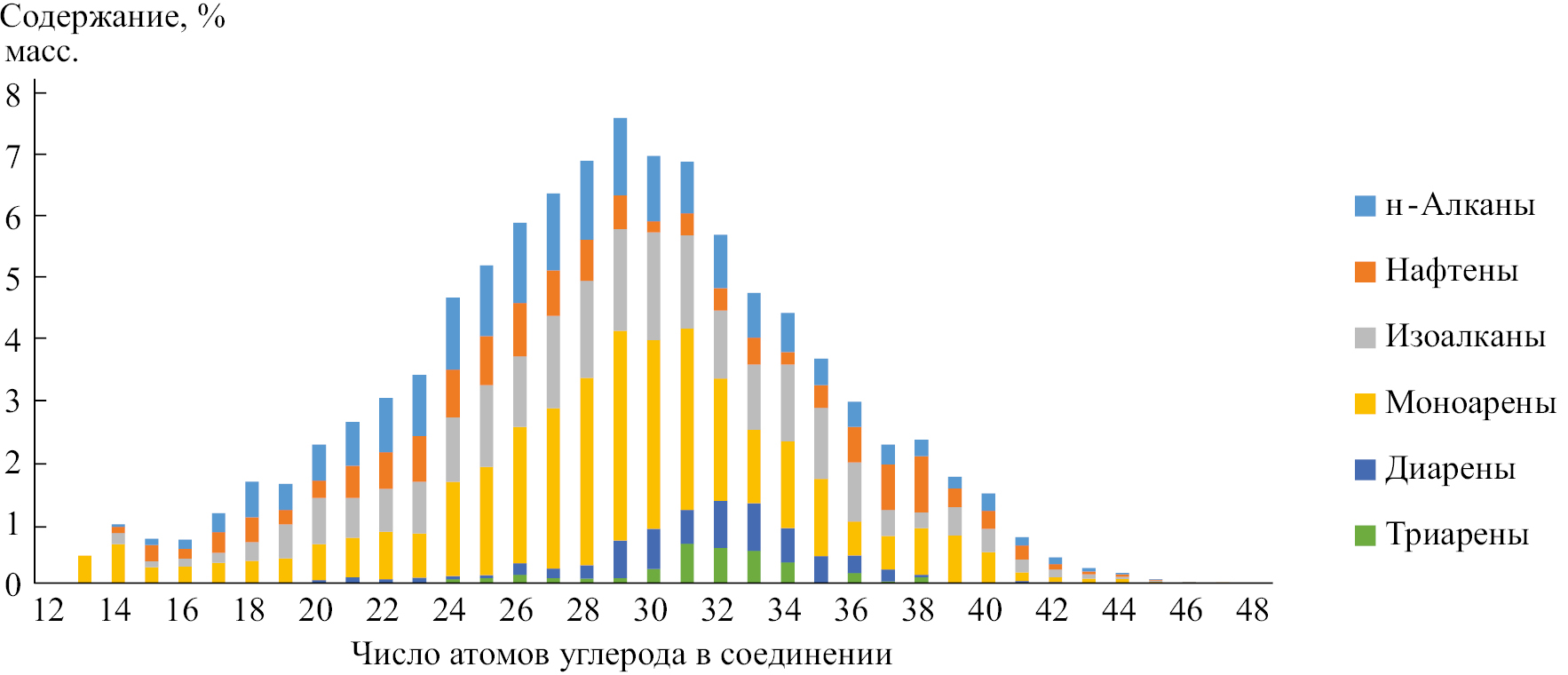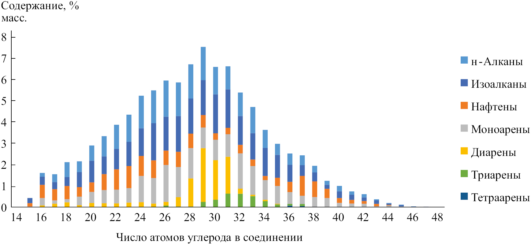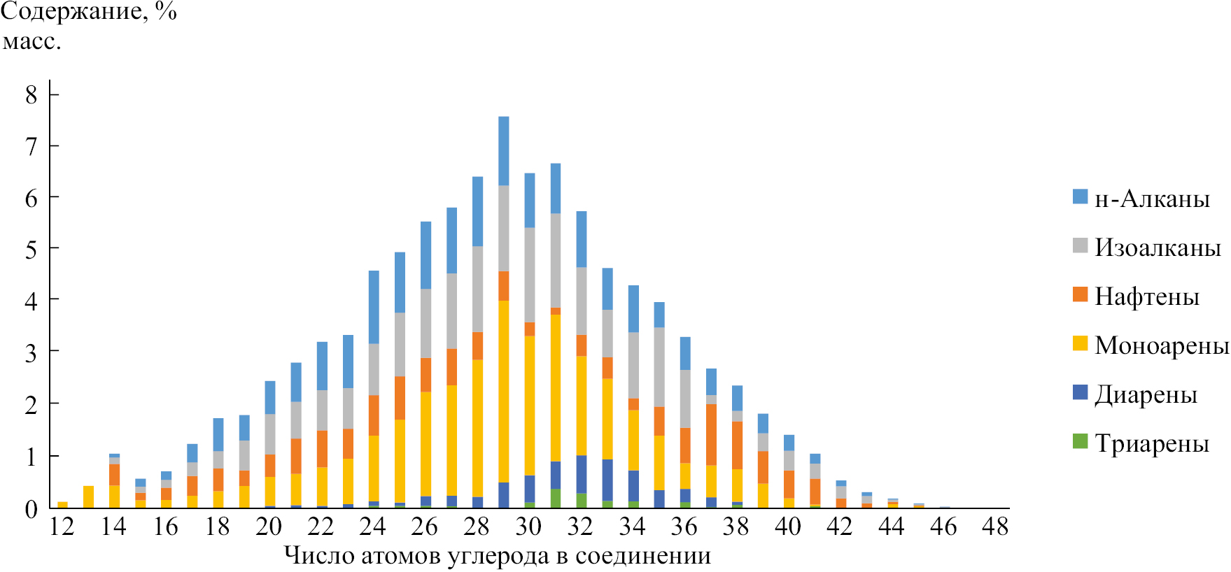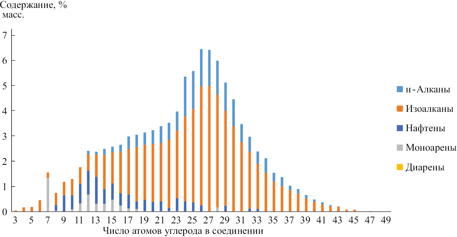 Углеводородный состав выделенных мальтенов вакуумного газойля определен на приборе CMS Agilent 7890B с пламенно-ионизационным детектором.