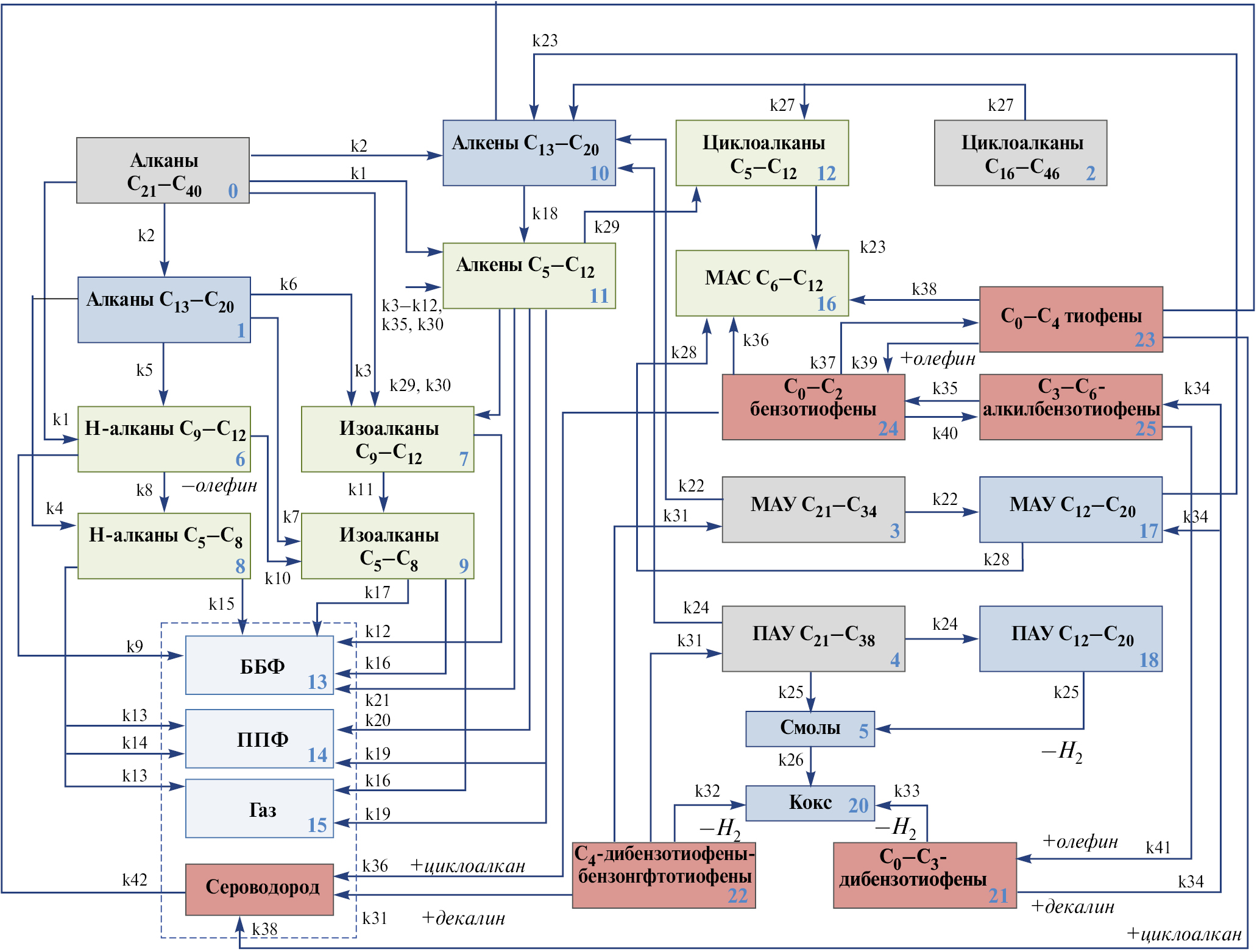 Вместе с тем описание формализованного механизма превращений углеводородов высококипящих нефтяных фракций является нетривиальной задачей, требующей создания подходов к формированию набора компонентов и расчету их физико-химических свойств.