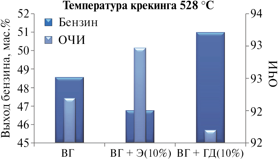 Прогнозные расчеты показали, что при вовлечении в переработку вакуумного газойля 10% высокоароматизированного компонента – экстракта селективной очистки масел, выход бензина снижается на 1,8% масс. с увеличением его октанового числа на 0,8 п., выход и содержание кокса возрастает на 0,56 и 0,11% масс. Снижение октанового числа бензина, вызванное вовлечением высокопарафинового компонента в переработку вакуумного газойля, составило 1,5 пункта при увеличении выхода бензина на 2,44% масс., при этом выход легких олефинов значительно возрос на 3% (153 т/сут). Установлено, что вовлечение в переработку смесевого сырья, содержащего 15% гача дистиллятного и 15% экстракта селективной очистки масел, позволяет увеличить производительность установки каталитического крекинга с 56,2 до 80,3% и является благоприятным при организации топливного режима.