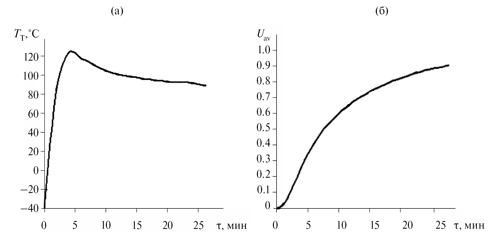 Рис. 1. Зависимости от времени температуры TT (а) и средней конверсии мономера Uav (б) в процессе блочной полимеризации изопрена в реакторе с неподвижным слоем (h = 3 мм): T0 = –40°C, TR = 86°C.