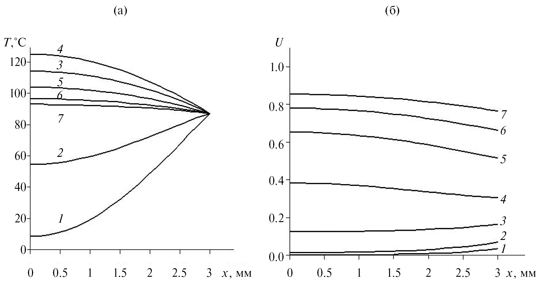 Рис. 2. Профили температуры T и конверсии U по вертикальной координате в процессе блочной полимеризации изопрена в реакторе с неподвижным слоем (h = 3 мм) в различные моменты времени (T0 = –40°C, TR = 86°C): 1 – τ = 0.5 мин, 2 – τ = 1 мин, 3 – τ = 2.5 мин, 4 – τ = 5 мин, 5 – τ = 5 мин, 6 – τ = 15 мин, 7 – τ = 20 мин.