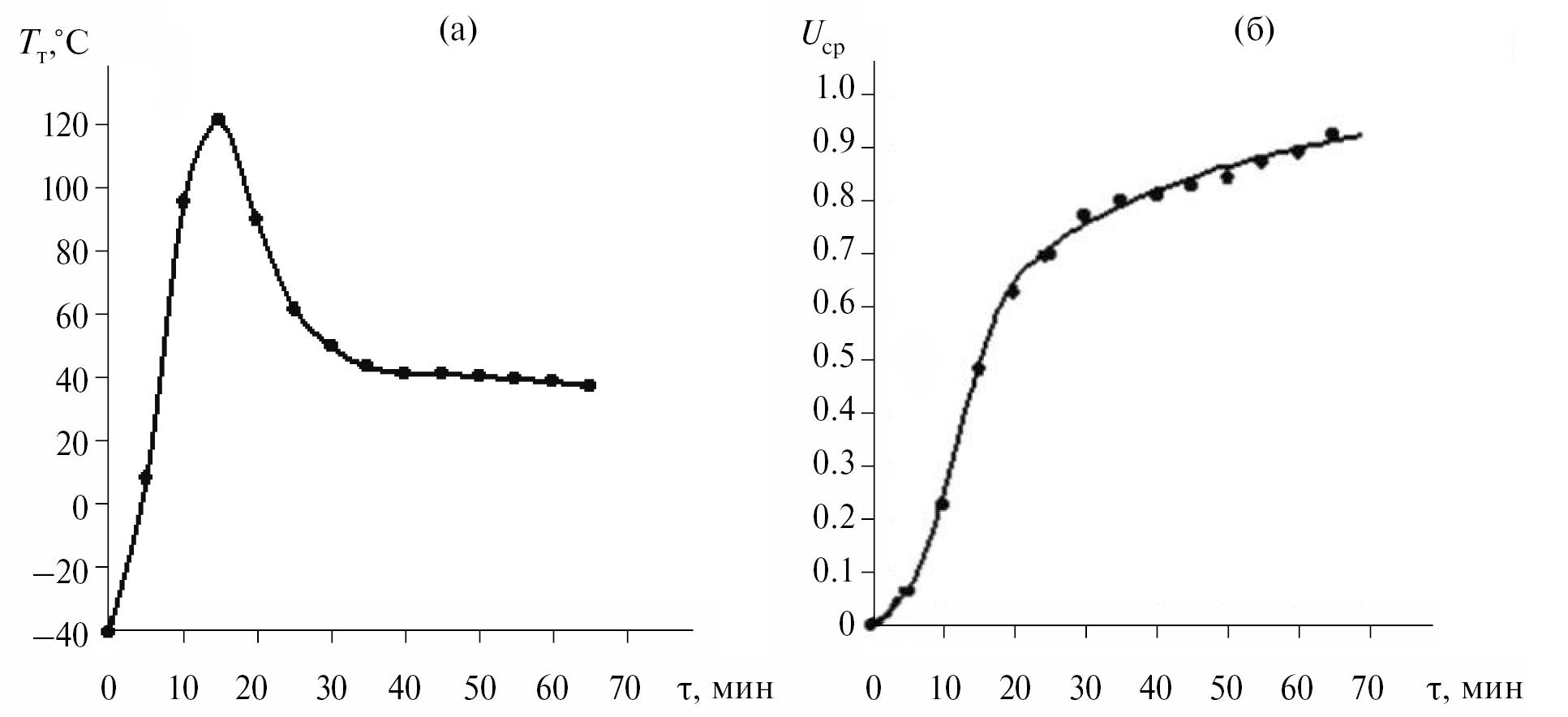 h = 3 мм, ТR = 86°С τgen = 26.7 мин, | h = 6 мм, ТR1 = 34°С при τ1 = 0, ТR2 = 45°С при τ2 = 18 мин, τgen = 55.4 мин (режим 1) | h = 6 мм, ТR1 = 34°С при τ1 = 0, ТR2 = 39°С при τ2 = 14.8 мин (режим 2) | |