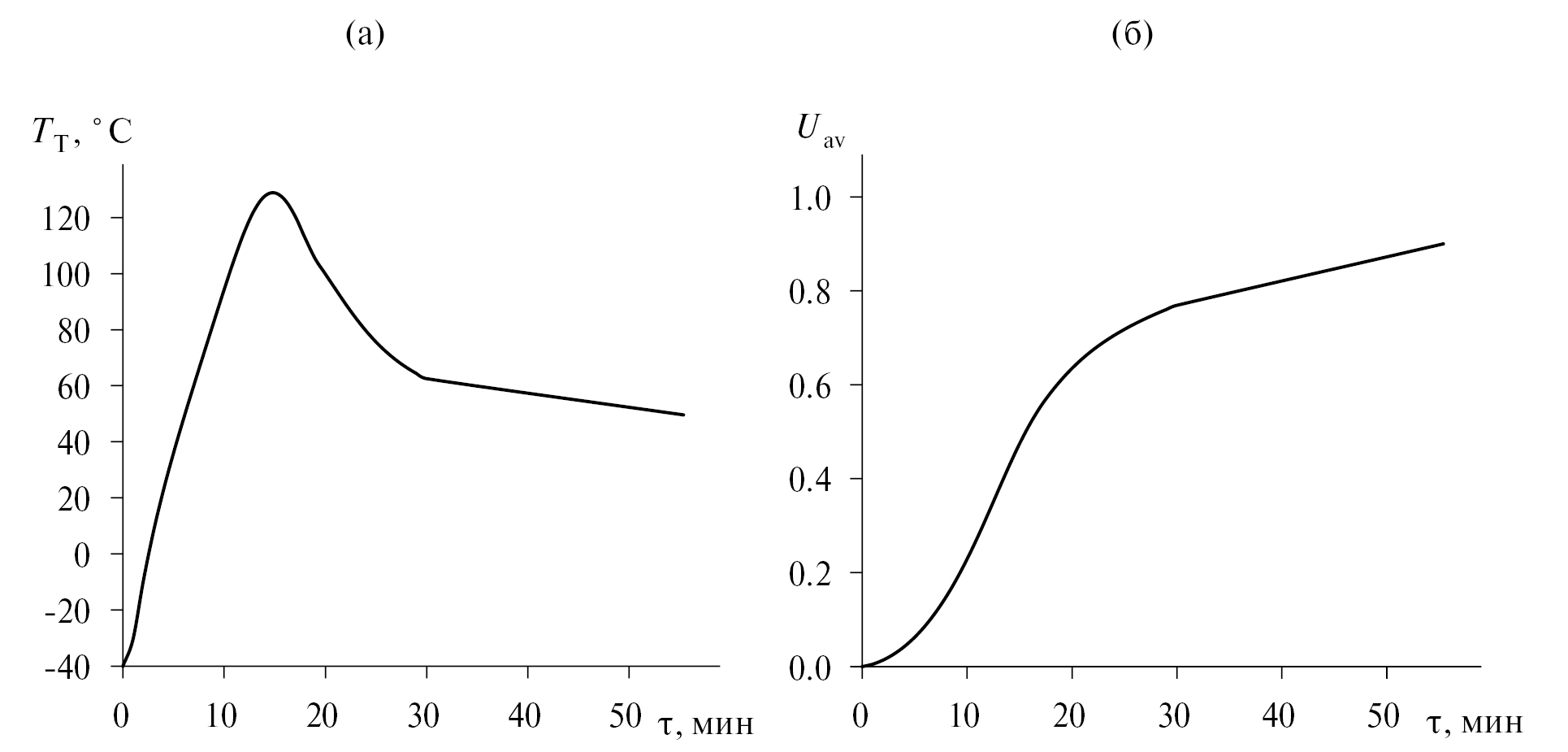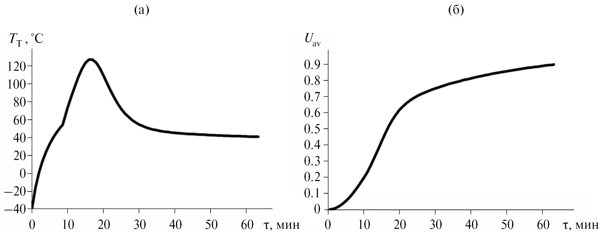 На рис. 7 приведены зависимости от времени температуры TT и средней конверсии мономера Uav в оптимальном режиме процесса, полученные численным решением уравнений (1)–(3), удовлетворяющие целевой функции (8) с ограничением (9).