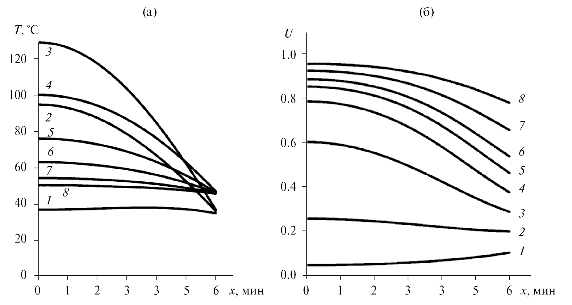 Рис. 6. Профили температуры Т (а) и конверсии U (б) по вертикальной координате в процессе блочной полимеризации изопрена в реакторе с неподвижным слоем (h = 6 мм) при ступенчатом изменении температуры хладагента в различные моменты времени (Т0 = –40°С, ТR1 = 34°С при τ1 = 0, ТR2 = 45°С при τ2 = 18 мин): 1 – τ = 5 мин, 2 – τ = 10 мин, 3 – τ = 15 мин, 4 – τ = 20 мин, 5 – τ = 25 мин, 6 – τ = 30 мин, 7 – τ = 40 мин, 8 – τ = 55 мин.