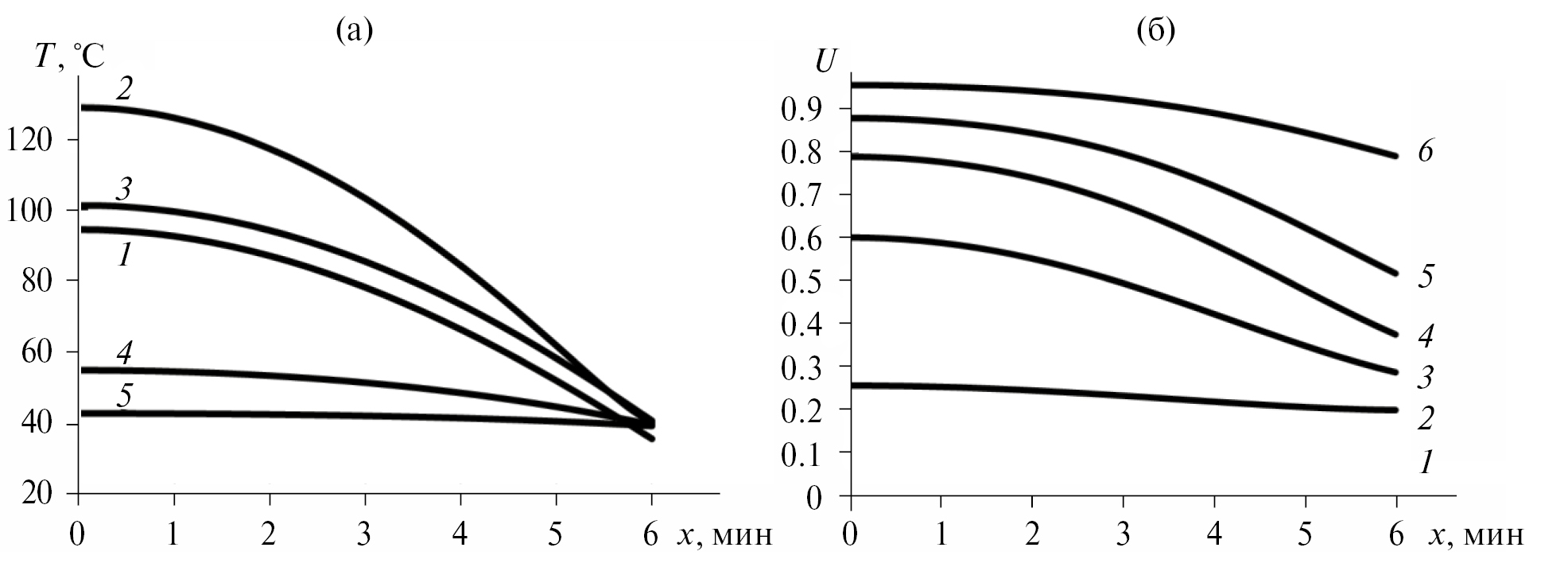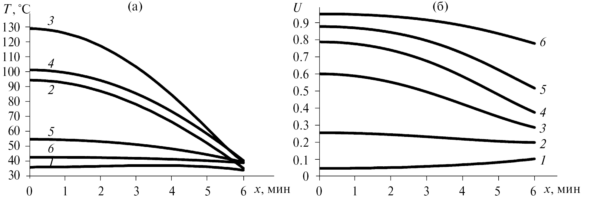 Рис. 8. Профили температуры Т (а) и конверсии U (б) по вертикальной координате в реакторе с неподвижным слоем (h = 6 мм) в оптимальном режиме процесса блочной полимеризации изопрена в различные моменты времени (Т0 = –40°С, ТR1 = 34°С при τ1 = 0, ТR2 = 39°С при τ2 = 14.8 мин): 1 – τ = 5 мин, 2 – τ = 10 мин, 3 – τ = 15 мин, 4 – τ = 20 мин, 5 – τ = 30 мин, 6 – τ = 61 мин.