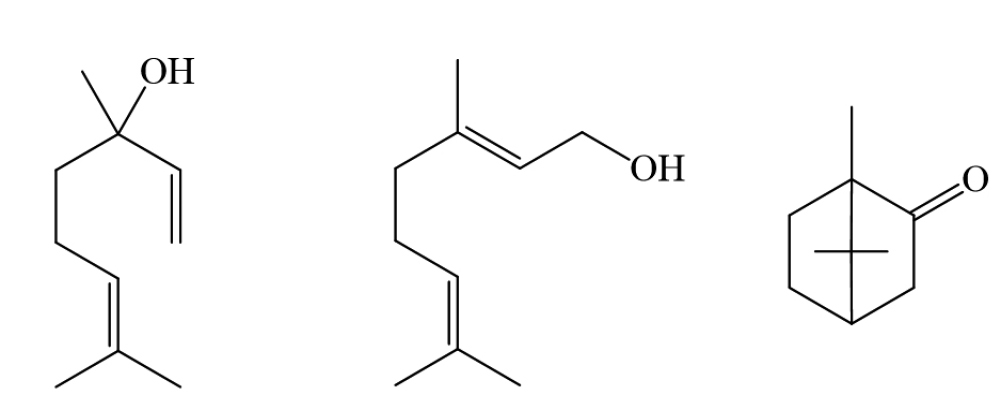 Рис. 1. Структурные формулы: а) линалоол, б) гераниол, в) камфора.