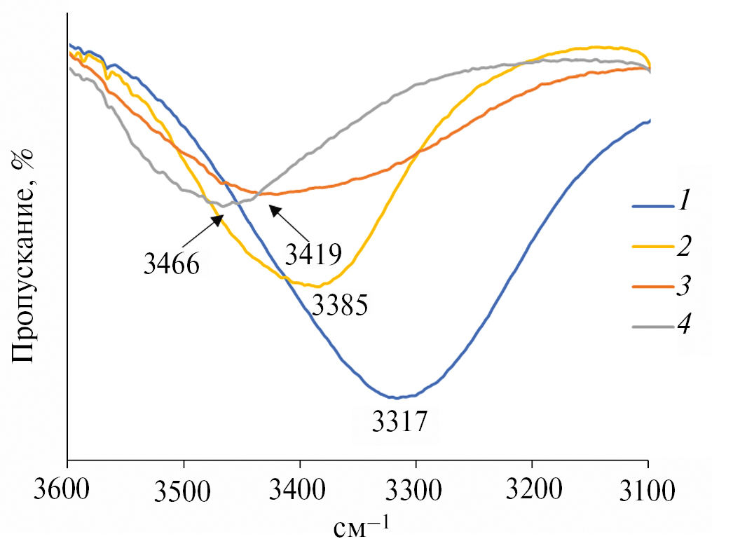 Проведен сравнительный анализ ИК-спектров индивидуальных компонентов и HES линалоол/камфора и гераниол/камфора при соотношении 1/1. В ИК-спектре камфоры (рис. 2) присутствуют характерные полосы поглощения, соответствующие валентным колебаниям группы C=O (1739 см–1). При этом на обоих спектрах HES наблюдался сдвиг данной группы (1741 см–1), что свидетельствует об ее участии в образовании HES. Кроме того, образование HES подтверждает сдвиг OH-группы линалоола и гераниола (3385 и 3317 см–1, соответственно) (рис. 3), вызванное смещением электронной плотности в сторону предполагаемой связи между водородом гидроксильной группы спирта и кислородом в молекуле камфоры, относительно исходного линалоола и гераниола (3466 и 3419 см–1, соответственно).