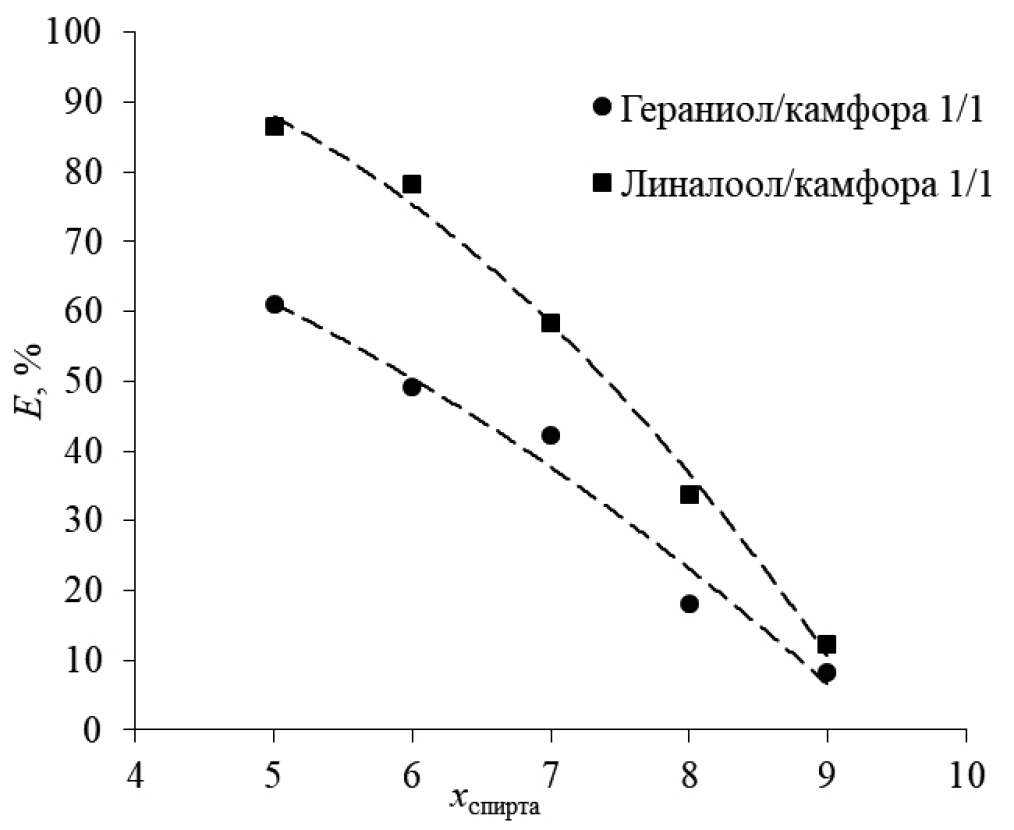 Наиболее эффективное извлечение ионов Fe(III) происходит при уменьшении количества гераниола (линалоола), то есть при соотношении спирт/камфора = 1/1, чем спирт/камфора = = 7/3. Данный феномен можно объяснить также тем, что спирт обладает экстракционной способностью по отношению к HCl, что приводит к снижению концентрации HCl в водной фазе и, как следствие, ухудшению экстракции ионов Fe(III). При этом снижение эффективности экстракции при увеличении количества спирта наиболее заметно в случае линалоола, что также связано с более основной OH-группой линалоола. Еще одной причиной повышения эффективности экстракции при добавлении камфоры является то, что камфора является кетоном и ее добавление, вероятно, приводит к проявлению синергетических свойств смеси [34], так как происходит разрушение самоассоциированного спирта и ассоциирование спирта и камфоры. Более подробно об этом будет сказано в следующем разделе.