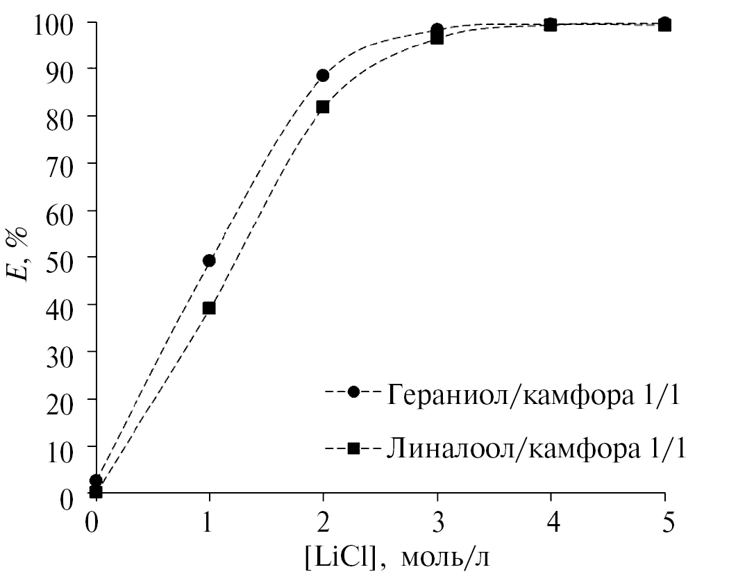 Рис. 8. Зависимость степени извлечения ионов Fe(III) от концентрации LiCl в водной фазе; [HCl] = 2 и 3 моль/л для HES гераниол/камфора 1/1 и HES линалоол/камфора 1/1 соответственно.