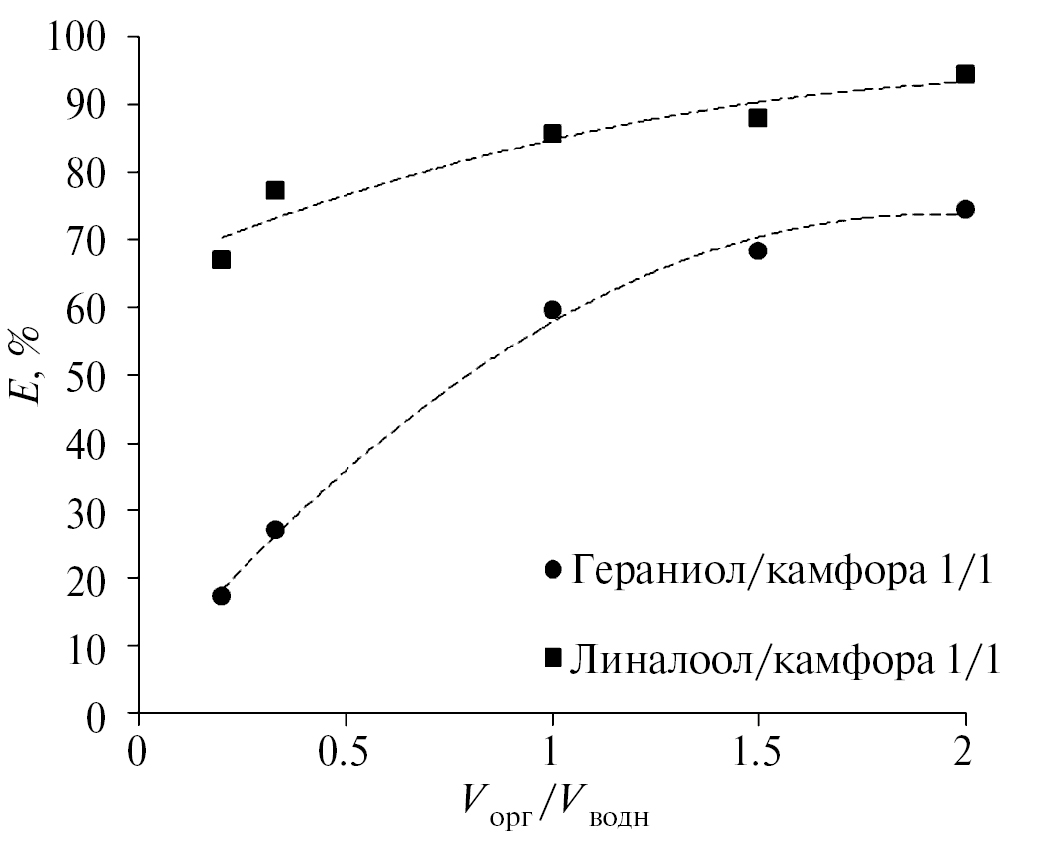 Исходя из полученных данных был рассчитан коэффициент синергизма для HES гераниол/камфора 1/1 и HES линалоол/камфора 1/1. Таким образом, можно сказать, что данные HES являются синергетическими смесями, в которых повышение эффективности экстракции происходит за счет улучшения экстракционных свойств спирта посредством взаимодействия с камфорой.