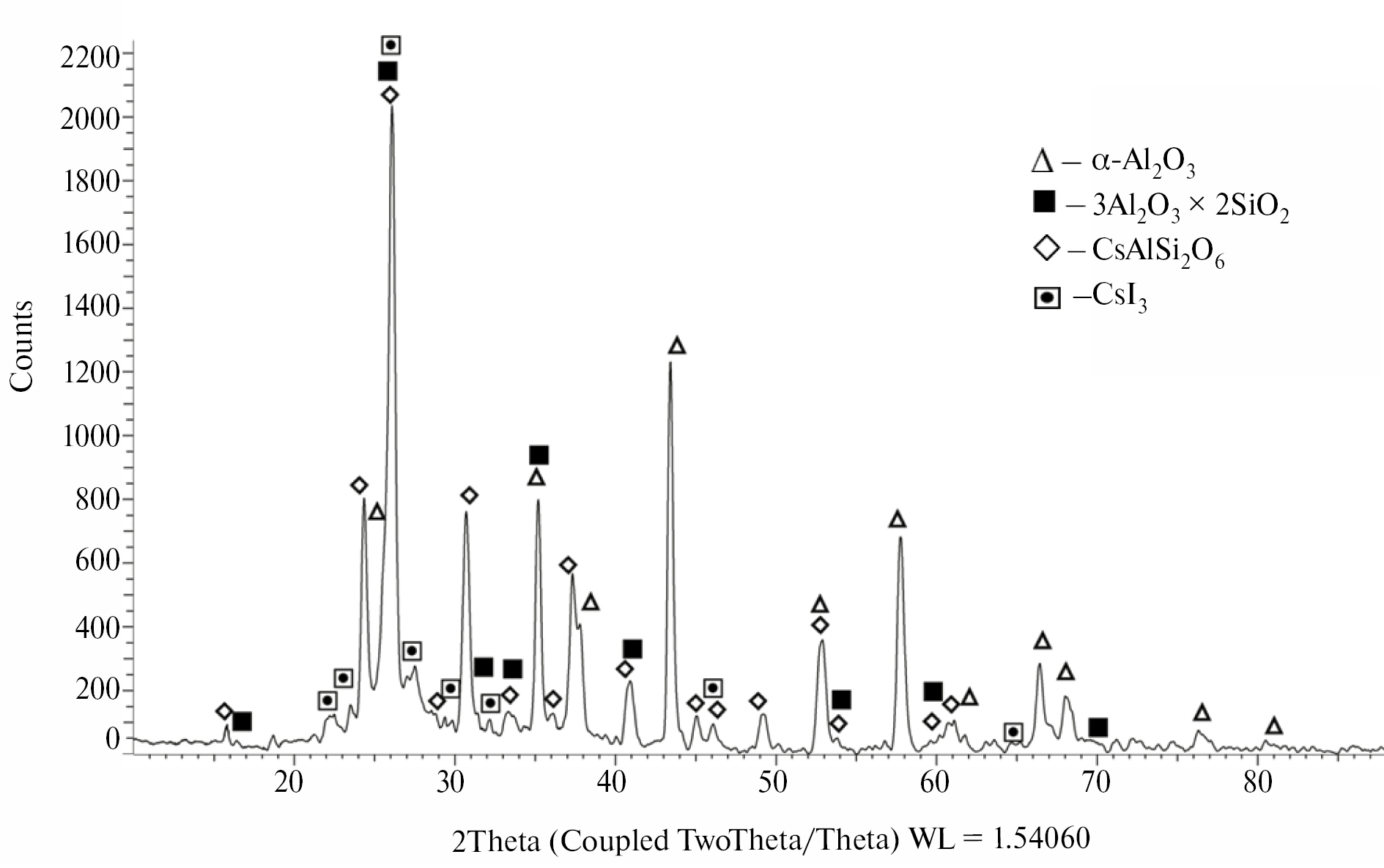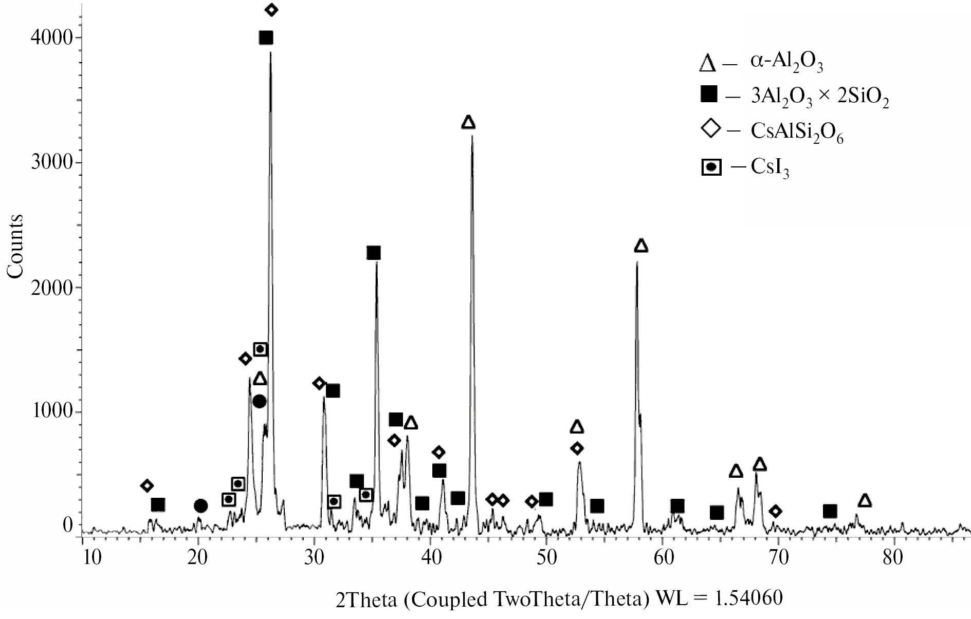 Характерная дифрактограмма образца КЭ, испытанного в среде азота при температуре 800°С, приведена на рис. 2. Кроме материалов ВПЯМ (корунд – 61.3%, муллит – 8.6% и следы кварца – 0.4%) в фазовом составе присутствуют поллуцит (12.9%) и 16.8% неразложившегося CsI. В данном случае степень диссоциации иодида цезия составляет 39.3%.