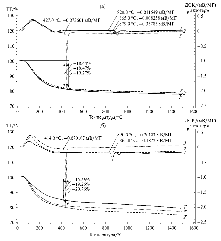 Рис. 6. Кривые ДСК порошков-прекурсоров (1‒х)(H₂SiO₃‒ZrO(OH)₂)‒хZrO(OH)₂, где х: 0.0 (1, сплошная), 0.5 (2, штриховая) и 1.0 (3, пунктирная); а также соответствующие кривые ТГ (1’, 2’, 3’): (а) – полученные соосаждением, (б) – полученные в микрореакторе.