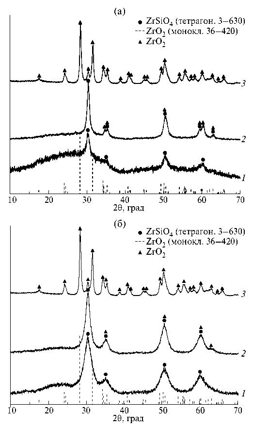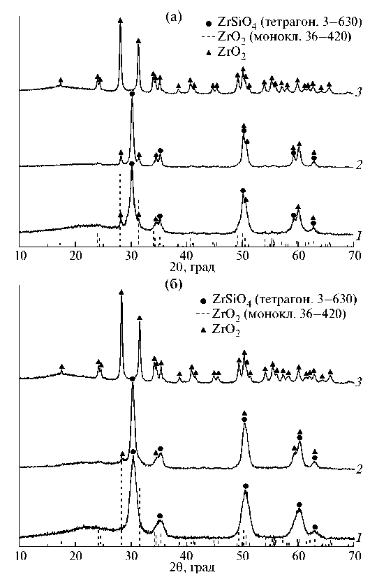 Рис. 8. Рентгеновские дифрактограммы порошков (1–х)ZrSiO₄–хZrO₂, где х = 0.0(1); 0.5(2); 1.0(3), после термообработки при 1000°C 24 ч: (а) ‒ соосаждение; (б) ‒ в микрореакторе.