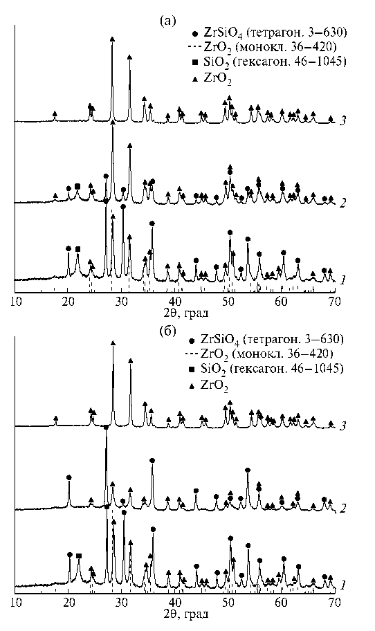 Рис. 9. Рентгеновские дифрактограммы порошков (1–х)ZrSiO₄–хZrO₂, где х = 0.0(1); 0.5(2); 1.0(3), после термообработки при 1300°C 24 ч: (а) ‒ соосаждение; (б) – в микрореакторе.