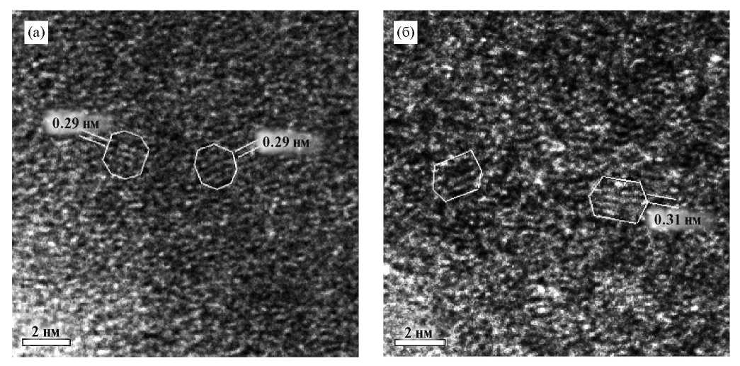Так, в образце, полученном обратным осаждением (рис. 10а), изредка встречаются кристаллические частицы размером до 5 нм, но в основном фаза существенно более мелкая – удается выделить частицы 1.5–2 нм. Межплоскостное расстояние около 2.9 Å, что скорее подходит кубической модификации ZrO₂. В образце, синтезированном в микрореакторе, наблюдаются частицы только малого размера, до 2 нм. При этом межплоскостные расстояния несколько больше, ближе к 3.15 Å. Можно предположить, что в этом образце больше моноклинной модификации ZrO₂. Циркон непосредственно в кристаллическом виде, по-видимому, на снимках не наблюдается, хотя с учетом погрешности кое-какие из наблюдаемых наночастиц могут к нему относится (основные плоскости (200) с периодом 3.30 Å).