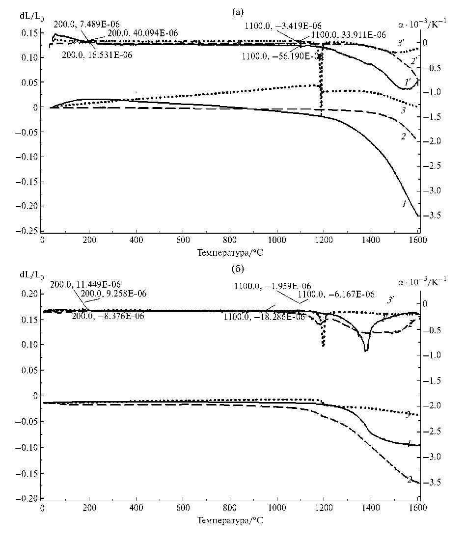 Рис. 12. Кривые дилатометрии керамических образцов ZrSiO₄ (1, сплошная), 0.5ZrSiO₄‒0.5ZrO₂ (2, штриховая) и ZrO₂ (3, пунктирная) и соответствующие кривые ТКЛР в интервале 100‒1500°С (1’, 2’, 3’): (а) – из порошков, полученных соосаждением; (б) – полученных микрореакторным синтезом.