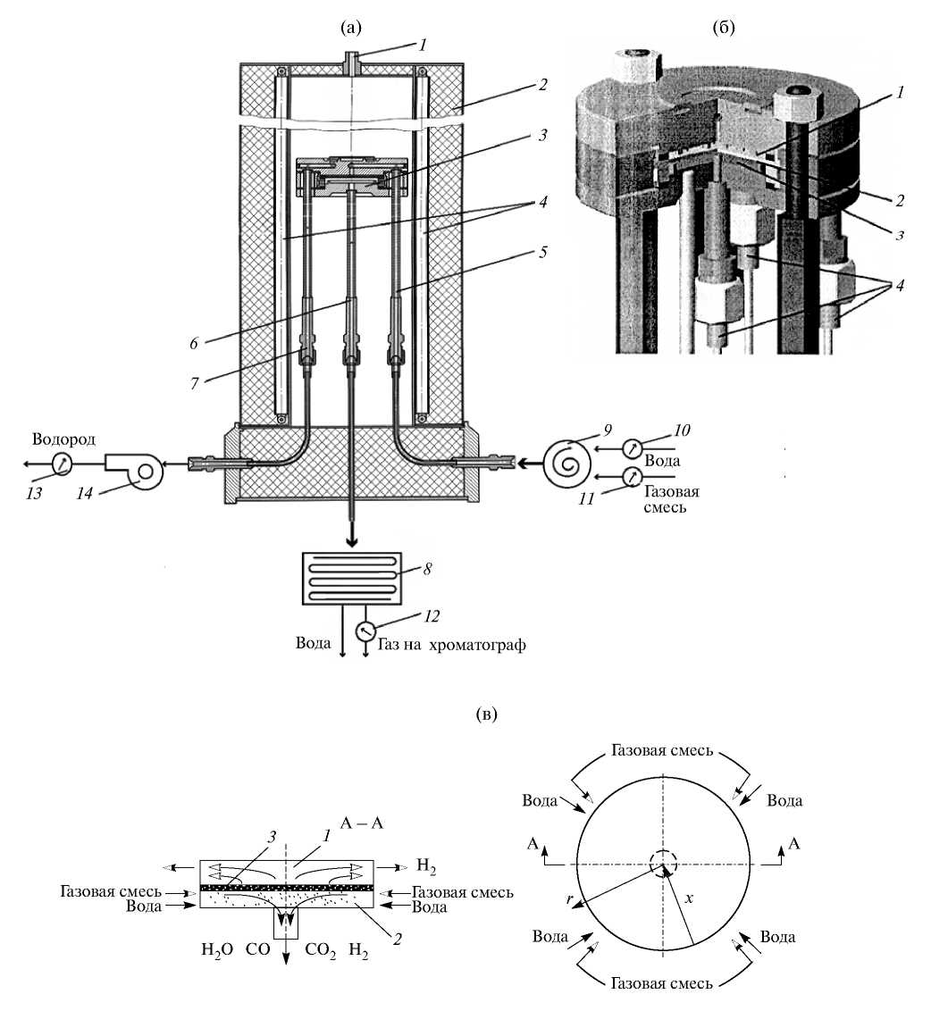 Рис. 1. Экспериментальная установка. (а) Вертикальное сечение. 1 – отверстие для трубки с термопарой, 2 – внешняя стенка, 3 – мембранный модуль, 4 – электронагреватель, (5–7) – стальные трубки для подачи сырья и выхода продуктов из нижней и верхней камер, 8 – холодильник, 9 – смеситель, (10–13) – ротаметры, 14 – вакуумный насос. (б) Мембранный модуль. 1 – верхняя камера, 2 – мембрана, 3 – нижняя камера, 4 – трубки для подвода сырья и выхода продуктов реакций. (в) Схема реакционной ячейки. 1 – верхняя камера, 2 – нижняя камера, 3 – мембрана. r – радиальная координата, x – безразмерная координата.