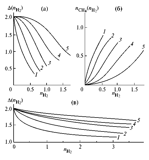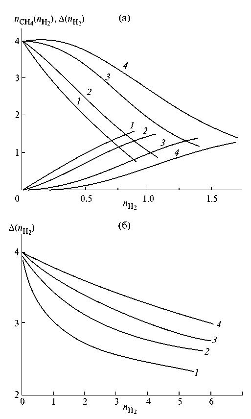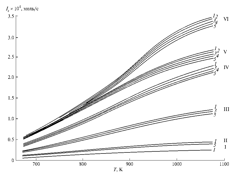Зависимости от температуры констант равновесия реакций K 15 MathType@MTEF@5@5@+= feaahGart1ev3aqatCvAUfeBSjuyZL2yd9gzLbvyNv2Caerbov2D09 MBdbqedmvETj2BSbqeeuuDJXwAKbsr4rNCHbGeaGqik8fkY=xipgYl h9vqqj=hEeeu0xXdi9arFj0xirFj0dXdbba91qpK0=yr0RYxfr=Jbb f9q8aq0=yq=He9q8qqQ8frFve9Fve9Ff0dmeaabaqaciaacaGaaeqa baqabeGadaaakeaacaWGlbWaaSbaaSqaaiaaigdacqGHsislcaaI1a aabeaaaaa@346E@  приведены в табл. 1. Как видно, для всех гомологов метана при T MathType@MTEF@5@5@+= feaahGart1ev3aqatCvAUfeBSjuyZL2yd9gzLbvyNv2Caerbov2D09 MBdbqedmvETj2BSbqeeuuDJXwAKbsr4rNCHbGeaGqik8fkY=xipgYl h9vqqj=hEeeu0xXdi9arFj0xirFj0dXdbba91qpK0=yr0RYxfr=Jbb f9q8aq0=yq=He9q8qqQ8frFve9Fve9Ff0dmeaabaqaciaacaGaaeqa baqabeGadaaakeaacaWGubGaeyyzImlaaa@33AA@  700 K эти константы намного больше единицы. Численные значения необходимых для дальнейшего изложения параметров при различных температурах для мембранного модуля с фольгой состава Pd–6%Ru представлены в табл. 1 ( w cat ' MathType@MTEF@5@5@+= feaahGart1ev3aqatCvAUfeBSjuyZL2yd9gzLbvyNv2Caerbov2D09 MBdbqedmvETj2BSbqeeuuDJXwAKbsr4rNCHbGeaGqik8fkY=xipgYl h9vqqj=hEeeu0xXdi9arFj0xirFj0dXdbba91qpK0=yr0RYxfr=Jbb f9q8aq0=yq=He9q8qqQ8frFve9Fve9Ff0dmeaabaqaciaacaGaaeqa baqabeGadaaakeaacaWG3bWaa0baaSqaaiaadogacaWGHbGaamiDaa qaaiaacEcaaaaaaa@35A6@  = 3.5 г, V ' cat MathType@MTEF@5@5@+= feaahGart1ev3aqatCvAUfeBSjuyZL2yd9gzLbvyNv2Caerbov2D09 MBdbqedmvETj2BSbqeeuuDJXwAKbsr4rNCHbGeaGqik8fkY=xipgYl h9vqqj=hEeeu0xXdi9arFj0xirFj0dXdbba91qpK0=yr0RYxfr=Jbb f9q8aq0=yq=He9q8qqQ8frFve9Fve9Ff0dmeaabaqaciaacaGaaeqa baqabeGadaaakeaacaWGwbGaai4jamaaBaaaleaacaWGJbGaamyyai aadshaaeqaaaaa@3584@  = 2 см3, s' MathType@MTEF@5@5@+= feaahGart1ev3aqatCvAUfeBSjuyZL2yd9gzLbvyNv2Caerbov2D09 MBdbqedmvETj2BSbqeeuuDJXwAKbsr4rNCHbGeaGqik8fkY=xipgYl h9vqqj=hEeeu0xXdi9arFj0xirFj0dXdbba91qpK0=yr0RYxfr=Jbb f9q8aq0=yq=He9q8qqQ8frFve9Fve9Ff0dmeaabaqaciaacaGaaeqa baqabeGadaaakeaacaWGZbGaai4jaaaa@32AE@  = 15.2 см2, δ' MathType@MTEF@5@5@+= feaahGart1ev3aqatCvAUfeBSjuyZL2yd9gzLbvyNv2Caerbov2D09 MBdbqedmvETj2BSbqeeuuDJXwAKbsr4rNCHbGeaGqik8fkY=xipgYl h9vqqj=hEeeu0xXdi9arFj0xirFj0dXdbba91qpK0=yr0RYxfr=Jbb f9q8aq0=yq=He9q8qqQ8frFve9Fve9Ff0dmeaabaqaciaacaGaaeqa baqabeGadaaakeaacqaH0oazcaGGNaaaaa@335B@  = 30 мкм).