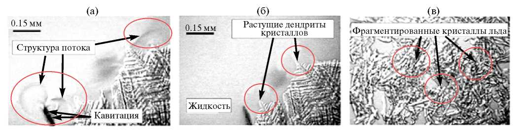 Рис. 1. Исследование замораживания раствора сахарозы с применением ультразвука: образование кавитационного потока (а); рост дендритных кристаллов льда (б); фрагментация кристаллов при воздействии ультразвуком (в).