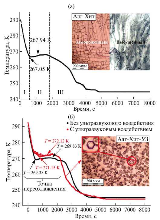 Анализ температурных кривых заморозки образцов альгинат-хитозана позволил определить длительность каждой стадии процесса заморозки: I – охлаждение раствора, II – фазовый переход, III – полная кристаллизация раствора. Для Алг-Хит температура начала зародышеобразования составила 267.05 K, а температура фазового перехода 267.94 K. Для образца Алг-Хит-УЗ температура фазового перехода составила 271.94 K.