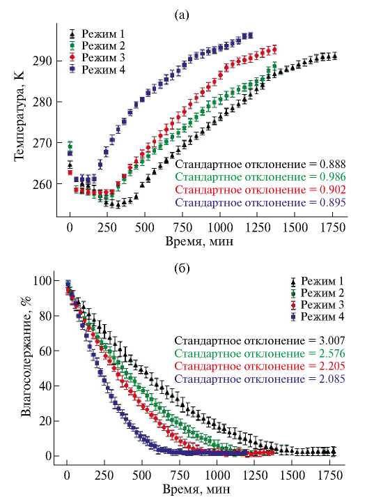 Для каждого из исследуемых режимов сушки было проведено три повторных эксперимента, необходимых для расчета стандартного отклонения.