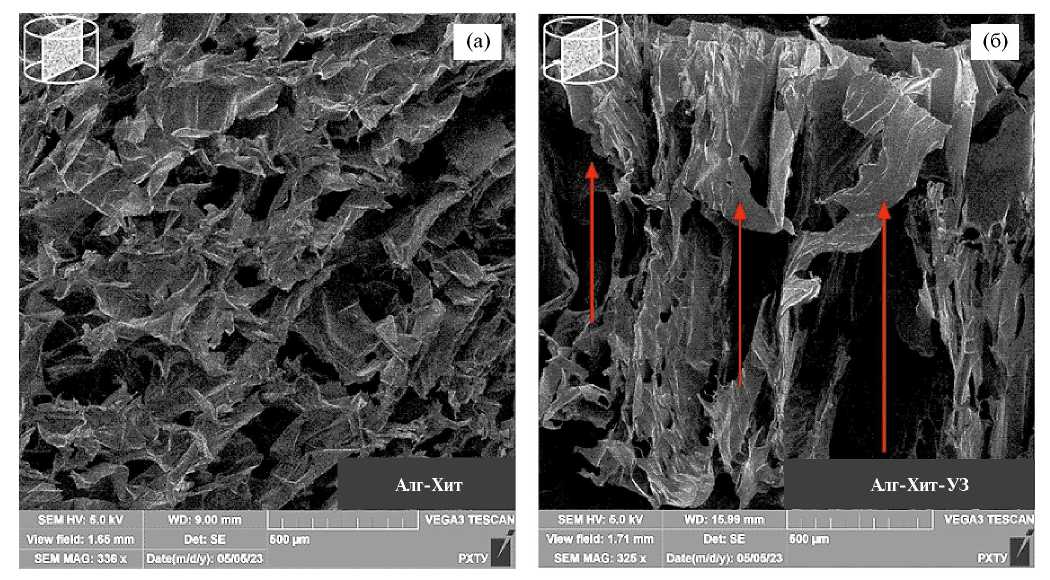 Рис. 7. Морфология поверхности матриксов на основе альгинат-хитозана: хаотическое распределение пор в объеме полимерного каркаса (а), образование микроканалов в полимерном каркасе, обработанном ультразвуком на этапе заморозки (б).