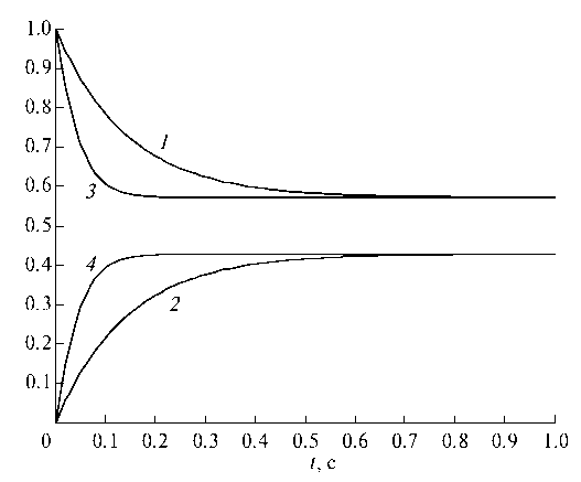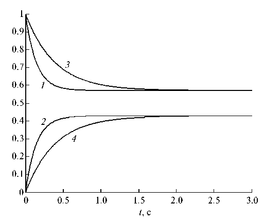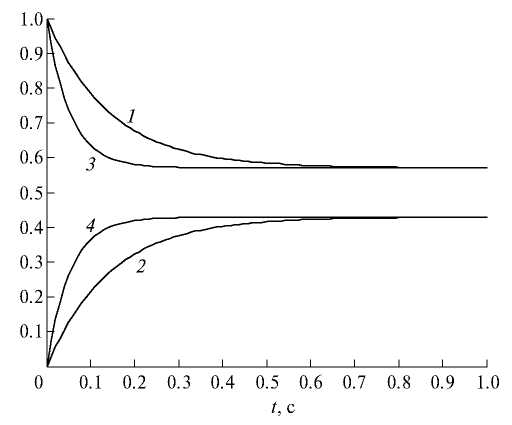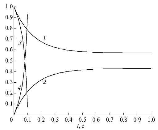 Рис. 4. Динамика концентраций интермедиатов реакции (1) с кинетикой ЗДМ при α = 0 и МДД (x*, z*) при γ = –1.4286 < 0: 1 – z; 2 – x; 3 – z*; 4 – x*.
