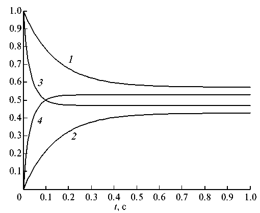 Рис. 3. Динамика концентраций интермедиатов реакции (1) с кинетикой ЗДМ при α = 0 и МДД (x*, z*) при γ = 1.4286 > 0: 1 – z; 2 – x; 3 – z*; 4 – x*.