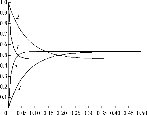 Рис. 7. Динамика концентраций интермедиатов реакции (28) с кинетикой ЗДМ при α = 0 и МДД (x*, z*) при a11= 1, a12= 2: 1 – z; 2 – x; 3 – z*; 4 – x*.