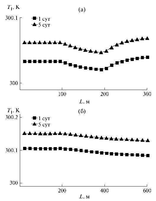 Результаты численных расчетов на модельной задаче показали, что при различных режимах течения в стволе скважины для однородного нефтяного пласта температура возрастает за счет эффекта Джоуля-Томсона со временем, но вдоль ствола практически не изменяется. Температура вдоль ствола горизонтальной скважины не будет постоянной в случае неоднородного нефтяного пласта. На рис. 2 приводятся кривые вычисленной температуры вдоль ствола горизонтальной скважины на разные моменты времени в случае неоднородного нефтяного пласта (от носка к пятке). Изменение температуры на рис. 2 показывает чувствительность предложенной модели к вариациям коэффициента проницаемости.
