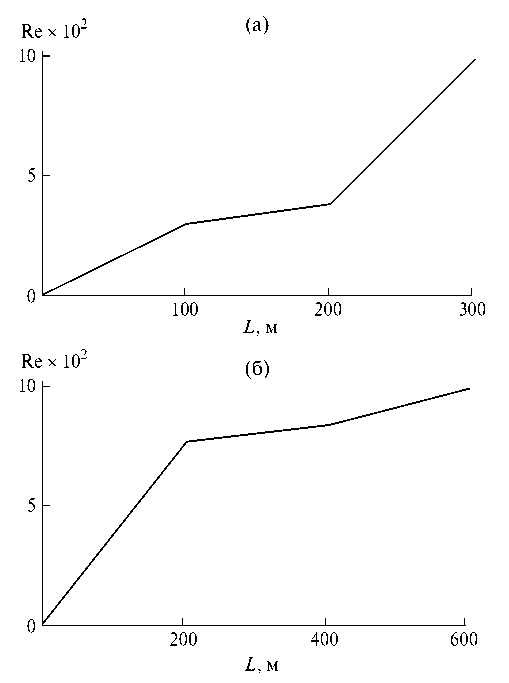 Рис. 3. Изменение числа Рейнольдса вдоль ствола. (a) – ламинарный поток, (б) – турбулентный поток.