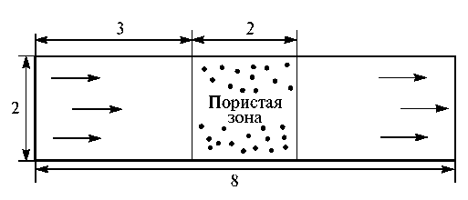 Тестовый расчет. Для верификации модели, вычислительного алгоритма и его программной реализации рассмотрим течение жидкости в прямоугольном канале с пористой вставкой [8, 10]. Геометрия расчетной области приведена на рис. 2.