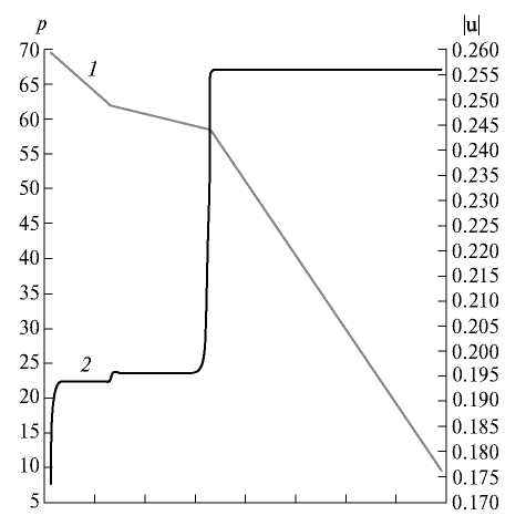 Рис. 6. Распределения 1 – давления и 2 – модуля скорости вдоль линии AB на рис. 5.