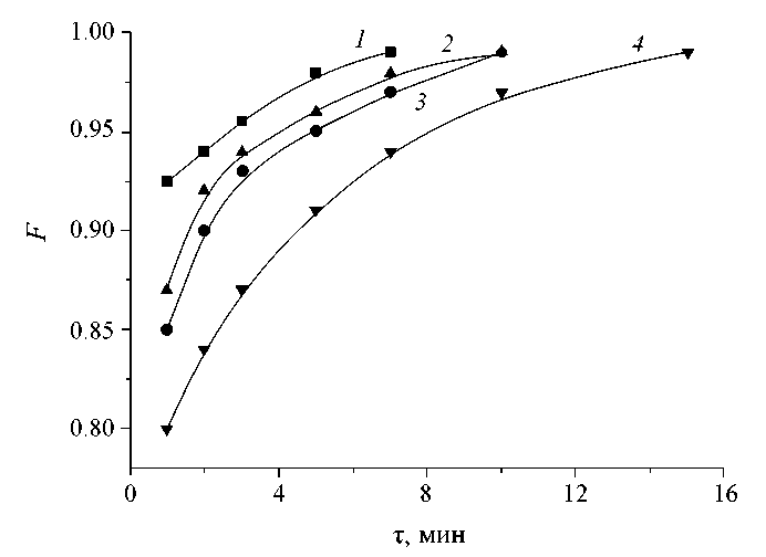 Экспериментальные кинетические кривые десорбции исследуемых ионов с фосфата титана указывают на быстрое протекание процесса (рис. 1). Согласно полученным результатам, равновесие десорбции достигается в течение 7–15 мин (F = 1). Большая скорость десорбции может указывать как на быстрый массоперенос ионов десорбата из раствора к активным центрам насыщенного сорбента, так и на быстрое их химическое связывание с ионогенными группами на поверхности ионита из-за большой разницы между концентрацией активных участков сорбента и десорбата в пограничном слое.