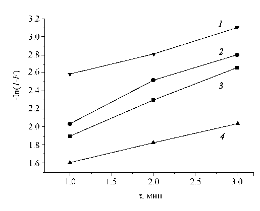 Рис. 2. Кинетика пленочной диффузии в координатах уравнения Бойда десорбции катионов тяжелых металлов на фосфате титана: 1 – Cu2+, 2 – Ni2+, 3 – Co2+, 4 – Mn2+.