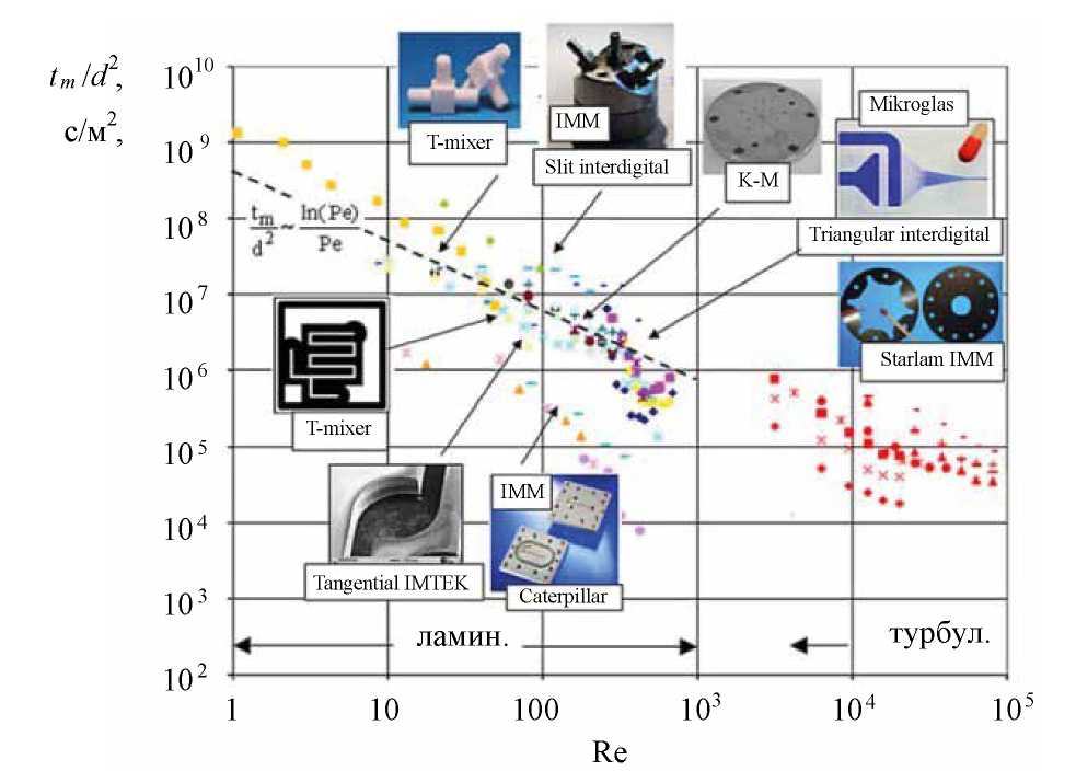 Рис. 1. Зависимость отношения времени микросмешения к квадрату характеристического размера (tm/d2) от числа Рейнольдса для восьми типов микросмесителей [18]. Штриховая линия соответствует формуле (7).