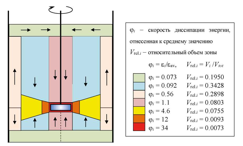 С другой стороны, для аппарата с турбинной мешалкой – одной из наиболее частой применяемых для диспергирования газа в жидкости – в работе [28] показано, что распределение удельной скорости диссипации энергии по объему крайне неравномерное (рис. 3): максимальное значение εloc (εi на рис. 3), отнесенное к среднему φi = εloc/εav = εi/εav, достигает φi = 34 для зоны непосредственно вокруг мешалки, при этом доля объема этой зоны составляет всего 0.0073, т.е. меньше 1%. При этом в трех периферийных зонах с долей объема 0.29, 0.343 и 0.195 получено φi = 0.56, 0.092 и 0.073 соответственно. В зонах вокруг мешалки и рядом с ней (красная, оранжевая и желтая зоны на рис. 3) с общим относительным объемом 0.092 (9.2%) выделяется 70.7% от общего количества энергии (в Вт).