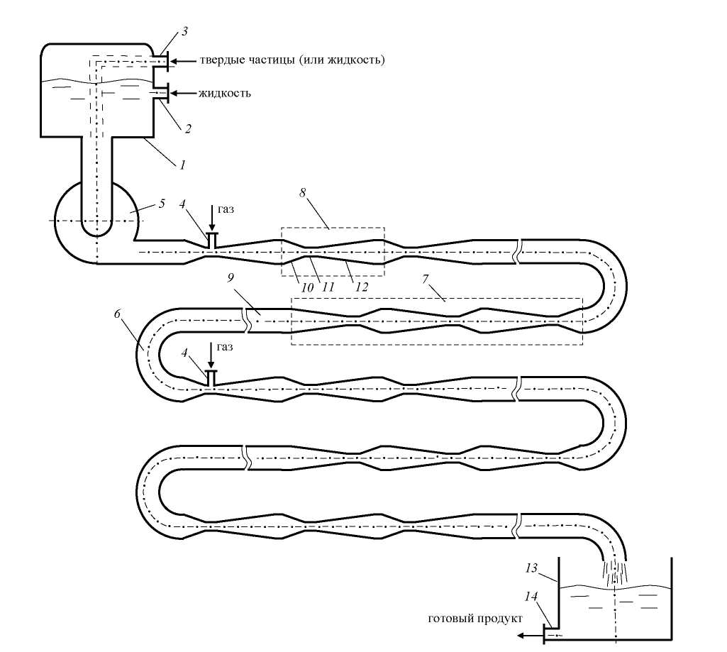 В качестве альтернативы предлагается использовать газожидкостные реакторы с дискретным вводом энергии, к примеру, реактор, изображенный на рис. 7, которому присущи два недостатка: накопление газа по длине аппарата, интенсивная коалесценция пузырей в зонах между эжекторами.