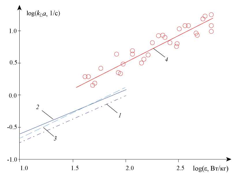 Рис. 12. Зависимость объемного коэффициента массоотдачи от удельной скорости диссипации энергии (ε, Вт/кг): линии 1–3 – в аппарате со статическими смесителями Lightnin (структуры 1–3 соответственно) и в пульсационном аппарате проточного типа (линия 4) при φ = 6%.