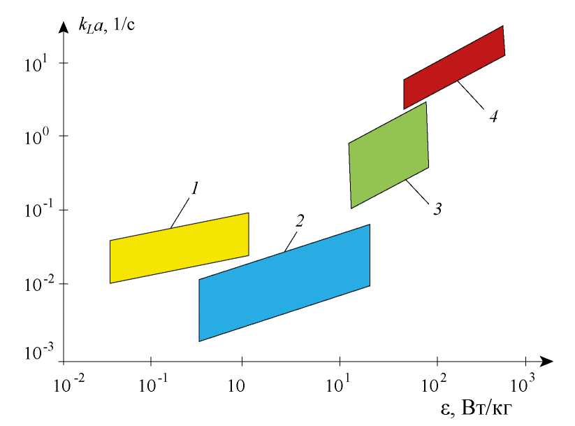 Рис. 13. Зависимость объемного коэффициента массоотдачи kLa (1/с) от средней удельной скорости диссипации энергии ε (Вт/кг) для газожидкостных реакторов: барботажные колонны (1), аппараты с мешалками (2), статические смесители (3) и ПАПТ (4) (области 1–3 построены по данным [33], область 4 – по данным [35]).