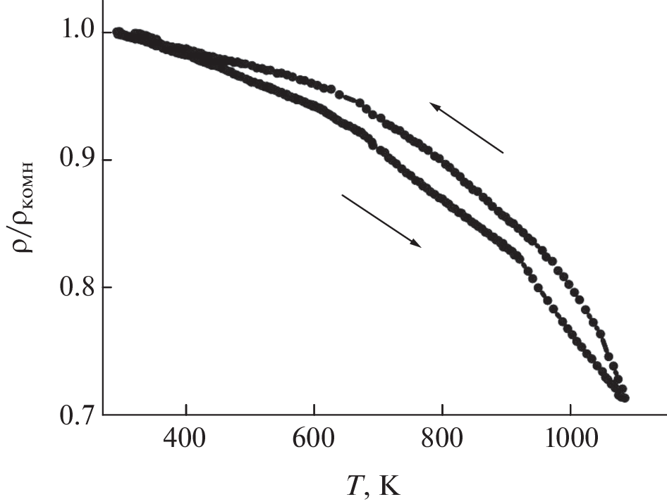 Исследованы структура и электросопротивление сплава Ni45Mn46In9. При комнатной температуре сплав Ni45Mn46In9 упорядочен в кубическую структуру L21, характерную для сплавов Гейслера. Во всей области температур от 77 до 1100 К наблюдаются большая величина удельного электросопротивления и отрицательный температурный коэффициент сопротивления. Проводимость подчиняется закону Мотта Т–1/4 с добавкой металлического вклада. Особенности, наблюдаемые на кривой температурной зависимости электросопротивления, позволяют предположить, что в данном сплаве характерный для ферромагнитных нестехиометрических сплавов Гейслера фазовый переход между кубической аустенитной фазой и мартенситной с более низкой симметрией происходит при необычно высокой температуре.