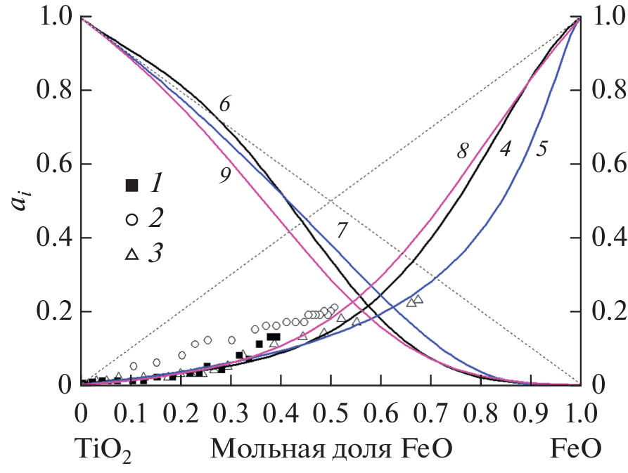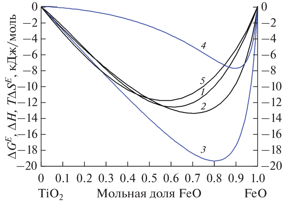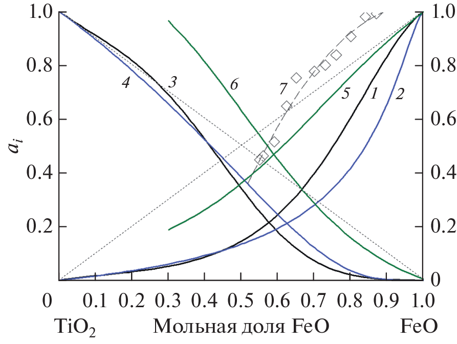 Методом высокотемпературной дифференциальной масс-спектрометрии изучены процессы испарения и термодинамические свойства образцов системы Fe2O3–TiO2, содержащих 25, 35 и 45 мол. % оксида железа. Как показано ранее, при температурах выше 1400 К Fe2O3, теряя кислород, превращается в FeO. Поэтому в данной работе проведено масс-спектрометрическое термодинамическое исследование системы FeO–TiO2 при температуре 1760 К. Определены состав и парциальные давления пара, а также значения активностей FeO и избыточной энергии Гиббса в системе FeO–TiO2. Привлечение полинома Вильсона позволило впервые оценить энтальпию смешения и избыточную энтропию в системе FeO–TiO2 при 1760 К. Проведено моделирование термодинамических свойств расплавов системы FeO–TiO2 при 1760 К на основе обобщенной решеточной теории ассоциированных растворов, и рассчитаны относительные числа связей различного типа в модельной решетке расплава, свидетельствующие о предпочтительном образовании связей Fe–O–Ti при содержании FeO, равном 55 мол. %. Показано, что при температуре 1760 К найденные значения избыточной энергии Гиббса в системе FeO–TiO2 свидетельствуют об отрицательных отклонениях от идеальности.