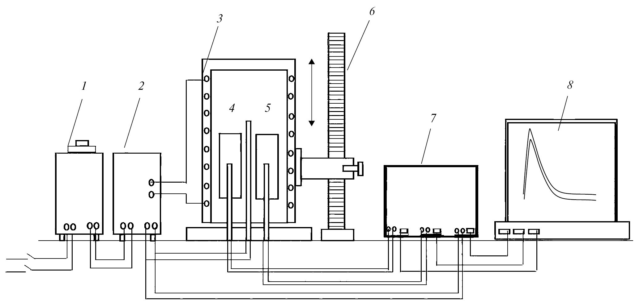 Измерение теплоемкости проводилось по методике, описанной в работах [20–23]. Схема установки представлена на рис. 1. Она включает в себя электропечь 3, которая смонтирована на стойке 6 и может перемещаться вверх и вниз (стрелкой показано направление перемещения). Образец 4 и эталон 5 (которые тоже могут перемещаться). С одного конца образцов высверлены каналы, в которые вставляются термопары. К цифровым многоканальным термометрам 7, подсоединенным к компьютеру 8, подведены концы термопар.