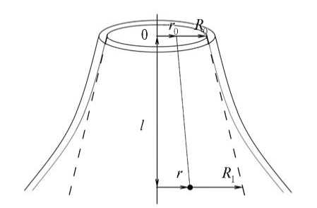 Рассмотрим простейшую расчетную модель (рис. 2). Штриховыми линиями показано предполагаемое расширение канала тока внутри вставки, в пределах которого ток равномерно распределяется по сечению канала. Пусть пылевая частица находится на глубине l от горла вставки и на расстоянии r от ее оси, а радиус равномерно расширяющегося канала на этой глубине есть R1. Тогда линия тока, отстоящая на глубине l от оси на расстояние r, проходит через горло вставки на расстоянии r0=rR0/R1 от оси. На глубине l плотность тока , а ее радиальная составляющая на расстоянии r от оси разряда