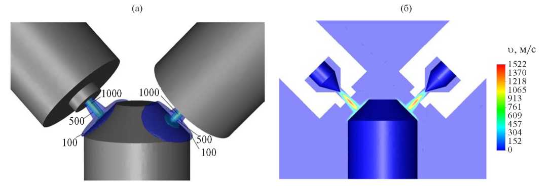 Рис. 3. Скорость плазмы в базовом режиме работы (I = 200 А, G = 0.8 г/с): (а) – трехмерное распределение (в м/с); (б) – двухмерное распределение в центральном сечении.