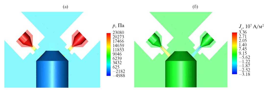 Из распределения давления (рис. 4а) видно, что внутри плазмотронов абсолютное давление достигает 1.23 атм и падает до 1 атм на выходе из сопла. Распределение z-составляющей плотности тока показывает (рис. 4б), что дуга замыкается через металлический электрод.