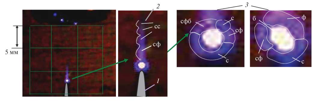 Рис. 6. Структура стримера в системе электродов игла–кольцо: 1 – игла, 2 – цепочечный стример, 3 – изменение короны с повышением напряжения (слева направо); цвета: б – белый, с – синий, ф – фиолетовый, сс – светло-синий.
