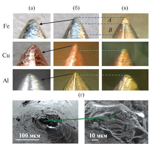 Рис. 8. Деградация электродов (вид сбоку): (а) – форма кончиков, (б) – до КР, (в) – после КР в течение 10 мин, (г) – оплавление кончика Fe-иглы (вид сверху).