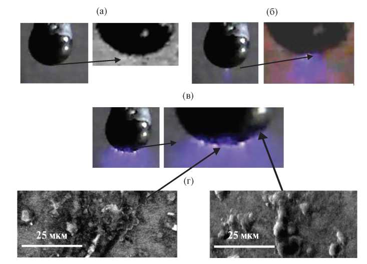 ВАХ на рис. 9 подобны ВАХ игольчатых катодов (рис. 3), что показывает идентичность ионизационных процессов. Именно генерация зарядов происходит в приэлектродной зоне свечения КР, развитие которой при увеличении напряжения показано на рис. 10. Из рис. 10а видно, что при h = 7 мм и средней напряженности E = U/h ≈ 11 кВ/см на поверхности шарика возникает тонкий ионизационный слой, а с повышением напряженности до E ≈ 13 кВ/см появляется точечная зона свечения (рис. 10б). С дальнейшим повышением напряжения число светящихся точек увеличивается (рис. 10в, E ≈ 15 кВ/ см), причем наблюдаются их хаотические перемещения по поверхности шарика. Этот эффект обусловлен процессом хаотического оплавления микробугорков и появлением микрократеров на поверхности шарика (рис. 10г), которые образуются на металлическом катоде в сильных полях даже в вакууме [15].
