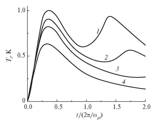 Рис. 5. Зависимость средней по объему Ti от времени: 1 – Te0 = 400 К, 2 – 200, 3 – 100, 4 – 50.
